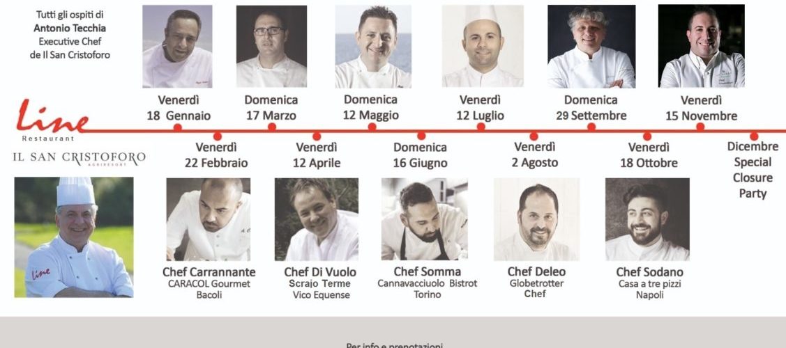 E ancora cultura, arte e dimostrazioni di alta cucina durante le serate organizzate al Ristorante “Line”, arricchite da molteplici interventi di professionisti del settore e dalla partecipazione degli allievi dell’istituto alberghiero “Tilgher” di Ercolano. Il tutto corredato dalla suggestiva cornice del parco de “Il San Cristoforo”.
